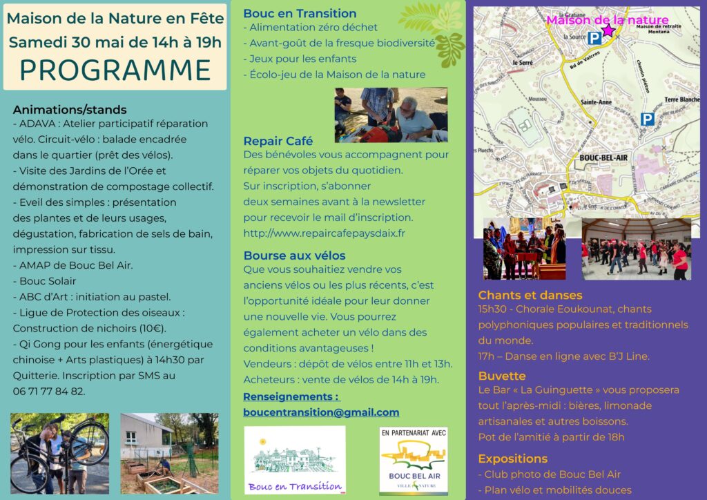 réparations de vêtements et d’aspirateur pour éviter de jeterConstruction d’un nichoir avec la LPOLarry proposait du bricolage et la fabrication d’objets en boisLes recettes de Clairequi utilisent les épluchures de légumesBière et limonade artisanales Légumes bio à gogo! l’AMAP de Bouc explique son fonctionnement.Comment s’initier à l’écologie avec des jeuxNos amis du Repair café du Pays d’Aix plongés dans l’électroniqueComment utiliser les plantes ? Et toujours les jeux de l’écologieNos élus ont apprécié l’ambiance. La bourse aux vélos. Les artichauts du Jardin de l’OréeQuitterie et le Qi-GongAmandine , jeune pianiste de l’Ecole de Musique de BoucWithout Jane Tout le monde danse avec AixtraSwing
